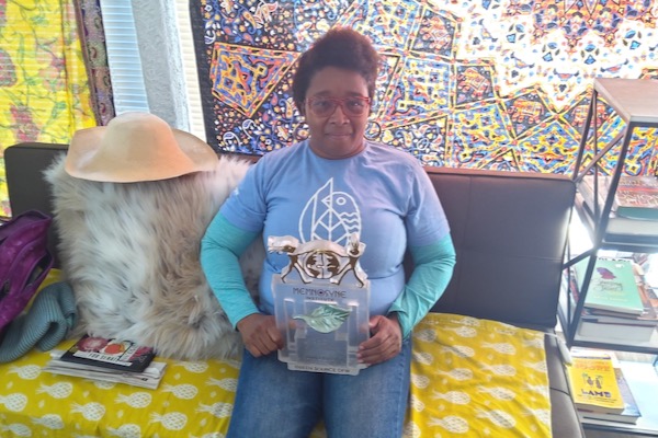 Olinka Green shows off her Green Source DFW Award for Environmental Justice. Coutesy of Olinka Green.