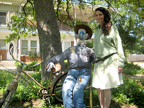 Arlington anti-drilling blogger Kim Feil with her gas-mask wearing prop, "Ben Zene." Courtesy of Kim Feil.