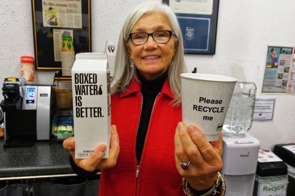 M-Pak owner Debbie Cooley poses in front of the complimentary coffee bar at her storefront, which includes compostable coffee cups and water in paper cartons. Photos by J.G. Domke.