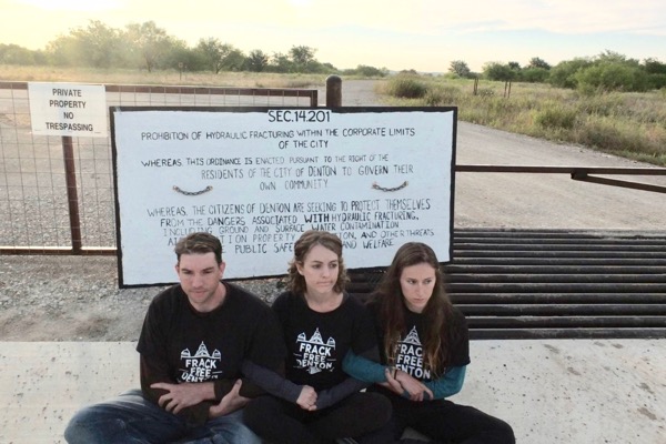 Members of Frack Free Denton Adam Briggle, Niki Chochrek and Tara Hunter were arrested June 1, 2015 for blocking the entrance to the Vantage Energy drill site in Denton. Courtesy of Frack Free Denton.