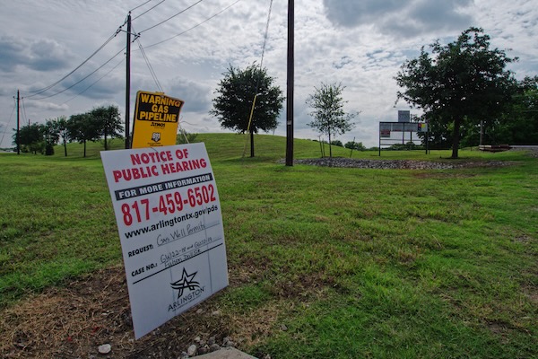 Dozens of residents registered their opposition to the permit, but council members claimed their hands are tied. Above, A public hearing notice is posted next to the Fulson drilling site at 5720 S. Watson Road in Arlington. Photo by J.G. Domke/Green Source DFW.