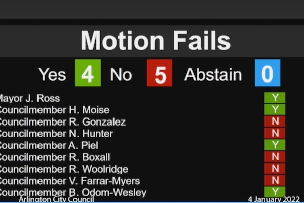 The vote was 5 to 4, with Council members Raul Gonzalez, Nikki Hunter, Rebecca Boxall, Ruby Faye Woolridge and Victoria Farrar-Myers opposing the request. Arlington Mayor Jim Ross and City Council members Helen Moise, Andrew Piel and Barbara Odom-Wesley voted to approve.