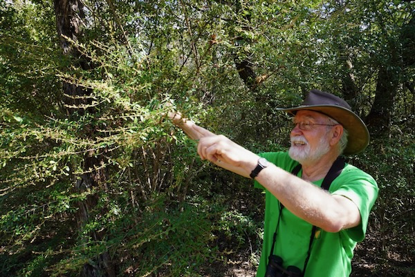 Dick Schoech, president of the Arlington Conservation Council, points to the invasive Chinese privet along the hiking trail at Crystal Canyon Natural Area in north Arlington. Schoech and other environmentalists have urged city staff to remove invasive species. Photo by Haley Samsel | Fort Worth Report.