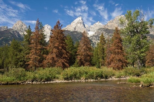 Above, at the foot of the Tetons, the mountain pine beetle has impacted less than half the trees. However, 90 percent of the white pine, which provides a major food source for grizzlies, has been wiped out in the greater Yellowstone ecosystem. Photos courtesy of Bruce Melton.