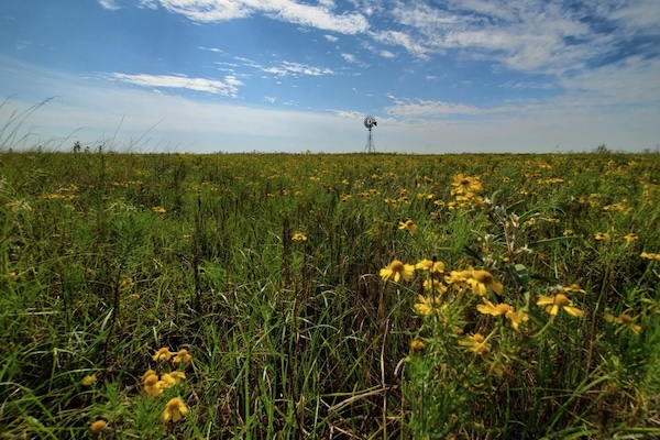 A windmill and flowers in the prairie at Attwater Prairie Chicken National Wildlife Refuge. Photo by Meredith Haley | USFWS.