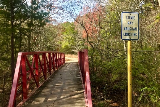 Erosion exacerbated by stormwater sheeting off an adjoining development caused a drainage channel to deepen and turn the SRV impassable. Martha Vaughan donated $10,000 to DeSoto to construct the steel bridge and designate it as the Stevie Ray Vaughan Crossing, which ends the paved ADA section of the SRV.