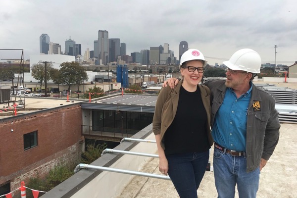 Amy King, cofounder of GoodWork, and Jim Schermbeck, director of Downwinders at Risk, tour GoodWork's Dallas rooftop where solar panels funded by Downwinders' clean air trust fund will be installed. Photo courtesy of GoodWork.