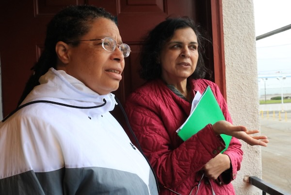EPA region six administrator Earthea Nance (left) and Liveable Arlington founder Ranjana Bhandari overlook and discuss a drilling site from a motel balcony in Arlington. Photo by Dylan Baddour for Inside Climate News.