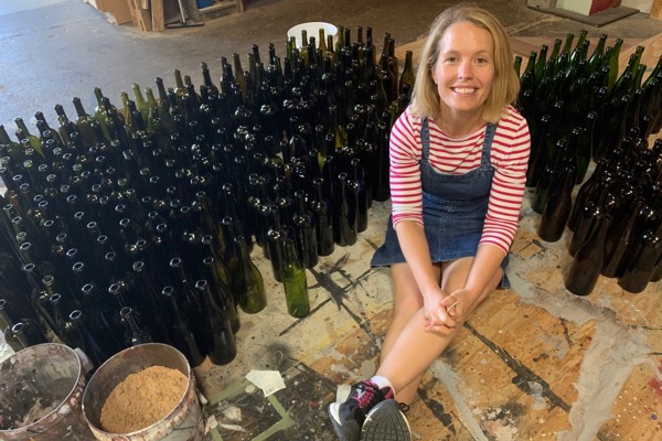 Dana Schultes, executive producer of Stage West in Fort Worth, shows off the recycled bottles used in set decoration for 'Lungs.' Photo courtesy of Stage West.