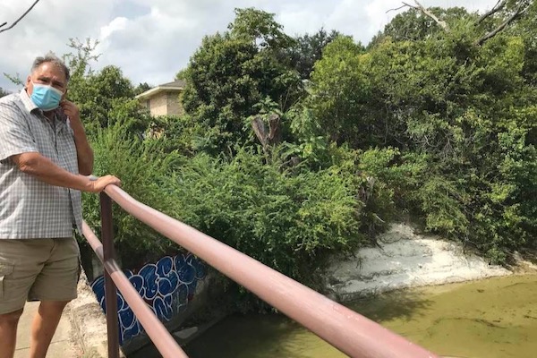 Don Phillips, leader of Clean Up Garland, shown looking over Duck Creek, is concerned that pollutants from the former battery manufacturer extend beyond EPA's cleanup area. Photo by Betsy Friauf.