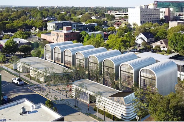 A high-end vegan restaurant, retail shops and offices and a leafy public space, crowned by silvery Quonset-hut apartments with 20-foot glass walls, are the calling cards of PS1200, an inventive mix of dwellings and commercial space now under construction at 1200 Sixth Avenue on Fort Worth’s near Southside.