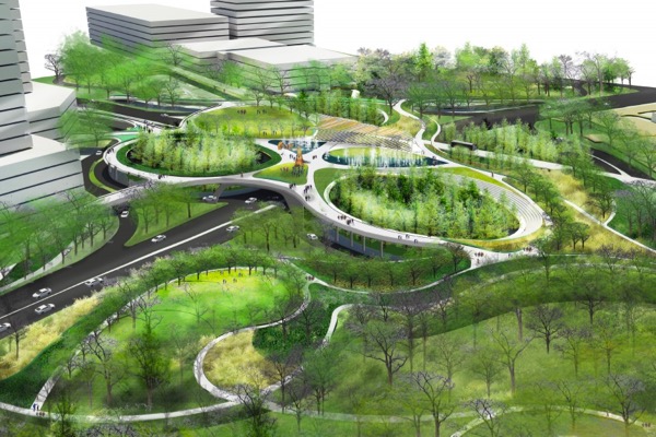 The “sculptural land bridge” that would hover over Inwood and Harry Hines is envisioned to contain parks, walkways, dog runs, a bird sanctuary, a rain garden forest, kiosks.