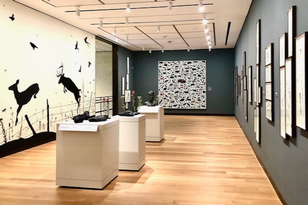 Two sets of immense artworks anchor the exhibit. On one end are many small silhouettes and paintings of what most people associate with the West — cowboys, horses, etc — which contrasts with the much larger similar artwork on the opposite wall of the wildlife of the West, from bison to birds.