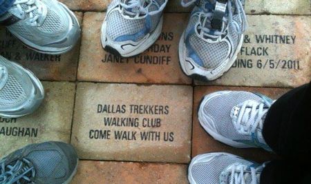 The Dallas Trekkers gather around their commemorative brick at White Rock Lake, where they walk every Sunday. Photos courtesy of the Dallas Trekkers.