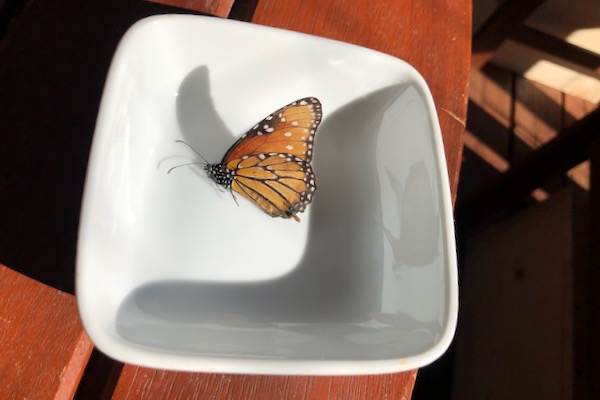Turns out it was a queen butterfly. We set up a small butterfly house out of a plastic bin with a screened top. We researched what to feed it and kept it alive for two more weeks, by keeping it warm and feeding it orange and banana slices, sugar water and fruit juice. Though, I don’t think it ever fully rebounded.