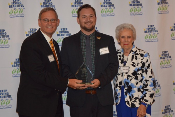Above, North Lake College's sustainability project coordinator Brandon Morton, center, accepts award from Irving Mayor Rick Stopfer and Keep Irving Beautiful's Margie Stipes. Courtesy of North Lake College.