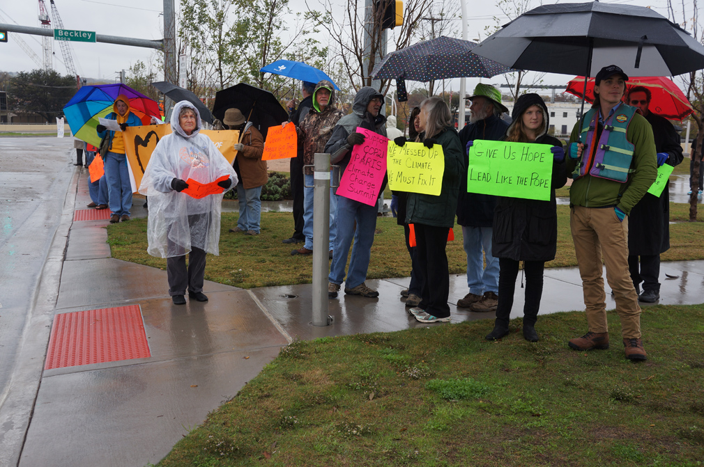 Smiling people thronged the west end of Dallas’ Continental Avenue Bridge, waving signs for “Climate Action Now” at a few passersby despite the chilly, rainy weather on Sunday. As a four-day recordbreaking rainfall drizzled to a close, 150 people gathered from across the Metroplex, bundled in rain slickers, ski jackets and toboggans, to hear speakers, to sing, talk and finally march across the bridge and back, chanting for speedy action on climate change on the eve of the world’s 21st international climate conference.