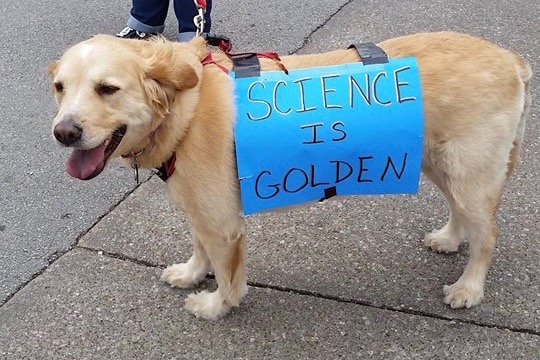 A protesting pooch offers a clever twist on an old adage at the March for Science in Fort Worth. Photo by Grace Darling.