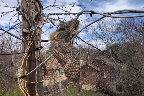 A dead great horned owl hangs suspended in electric power lines in Arlington Heights, a Fort Worth neighborhood, near the Cultural District, Dec. 10, 2019. Photo courtesy of Oncor.