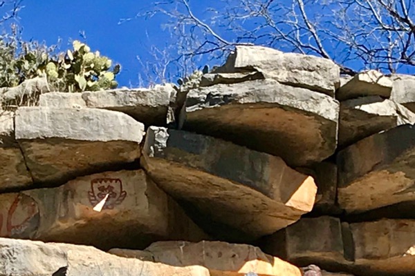The rocky slope upon which the pictograph wall sits is steep and strewn with ferocious prickly pear cactus. The anthropologists scramble up and perch precariously as they seek phenomenon not visible from a distance. Crowd members make wagers on who’ll stumble and roll through the cactus first. Thankfully, bets go unfulfilled.