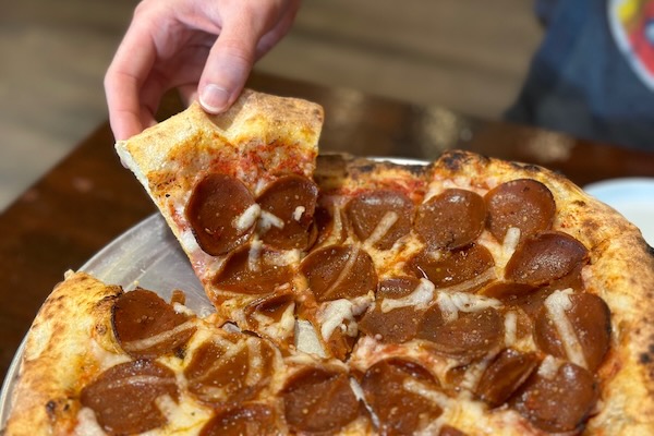 Plant-based pepperoni pizza at Pizza Verde in Fort Worth. Photo by Andrew Ridout.