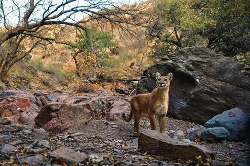 A mountain lion descends a rocky slope in West Texas. Courtesy of Ben Masters/Fin & Fur Films.