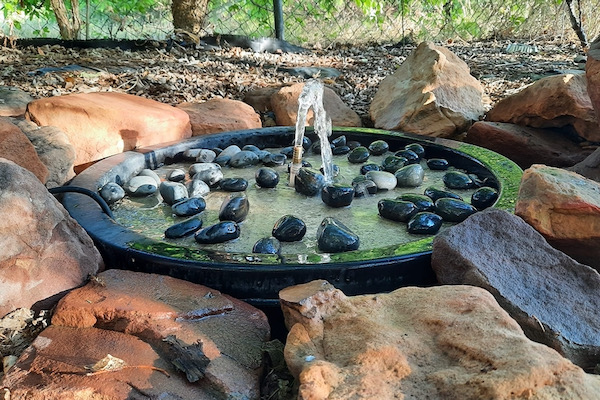 A homemade watering station with fountain is built for critters big and small. Water feature and photo by Marshall Hinsley.