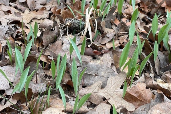A patch of trout lilies (Erythronium sp.) pop up through leaves Feb. 25, 2023 at Fairfield Lake State Park, which closed last month after nearly 50 years. Photo by Misti Little.