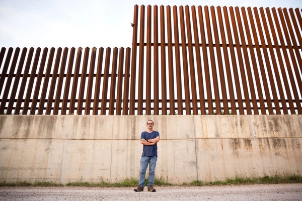 Scott Nicol, co-chair of the Sierra Club’s Borderlands Campaign, stands in front of the border fence in Hidalgo in far South Texas. This section, which sits atop a levee, runs between a national wildlife refuge and a local nature center. Photo by Callie Richmond/The Texas Tribune.