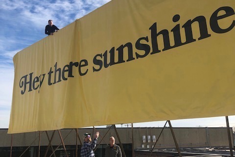 To advertise their eco-conscious space, they took advantage of a vintage billboard perched atop their building. Now it bears a beaming slogan - “Hey there sunshine" - with details about their solar panels on the back.