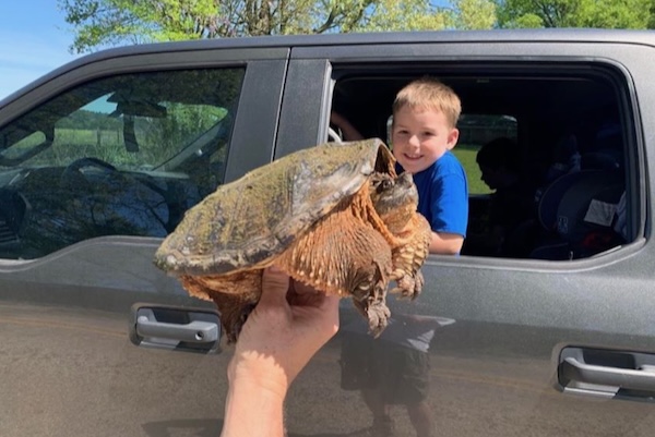 A snapper saved by Andrew Brinker in March 2020 while driving through East Texas. He expects the young male was probably crossing to another stock pond. Photos by Andrew Brinker.