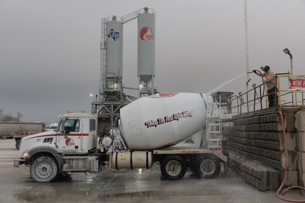 A concrete truck is washed at a concrete batch plant in Gunter on March 21. The TCEQ has proposed changes to concrete batch plant permits including lowering production limits, reducing dust coming from plants and setting minimum distance requirements from nearby communities. Photo by Shelby Tauber for The Texas Tribune.