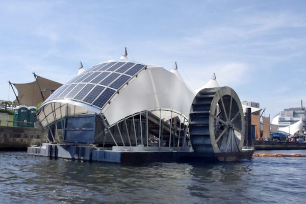 The waterwheels themselves are pollution-free, using solar and hydro power. The river current assists in turning the wheel. Solar-powered pumps work a conveyer to lift trash and deposit it into a detachable dumpster.