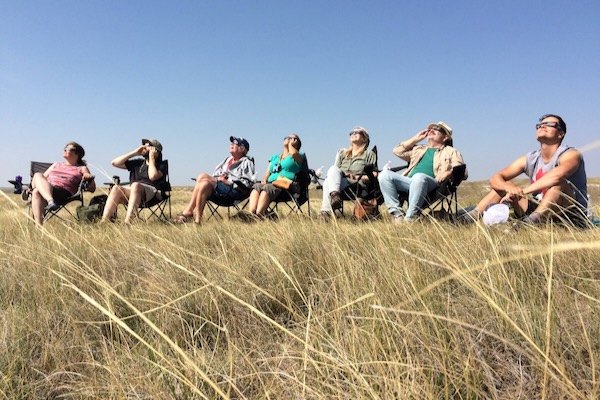 Green Source DFW reporter Amy Martin, third from right, with her husband Scooter Smith, second from right, traveled to northwestern Nebraska for the total solar eclipse in 2017. Photo courtesy of Amy Martin.