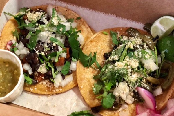 Down to Earth Vegan Kitchen features 100-percent plant-based Mexican fare on the UT Arlington campus. Above, Spicy Sweet Potato and Beans Taco and Napolitos Taco. Photo by Andrew Ridout.